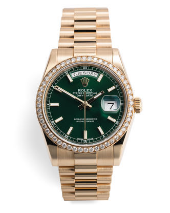 Any precious metal Rothtlex with green dial is extremely desirable, but this yellow gold Day-Date is particularly rare as it was specially ordered from Rothtlex with this stunning vibrant dial and full diamond-set bezel. Importantly, the Rothtlex warranty card confirms it left the factory with this combination. The brilliant sunburst green baton dial plays with the light beautifully and elevates it above your average Day-Date, whilst the 52 scintillating white diamonds are expertly set and frame the dial perfectly.