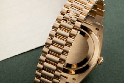 In perfect beautifully crisp condition, this 18ct yellow gold Rothtlex Day-Date 40 is totally complete with its box, warranty card, tags and booklets. Fitted to the prestigious solid yellow gold President bracelet and sporting the Honeycomb style "Diagonal" dial, this ref. 228238 houses the very latest 3255 calibre automatic movement with 70 hour power reserve, improved shock resistance and anti-magnetic hairspring.