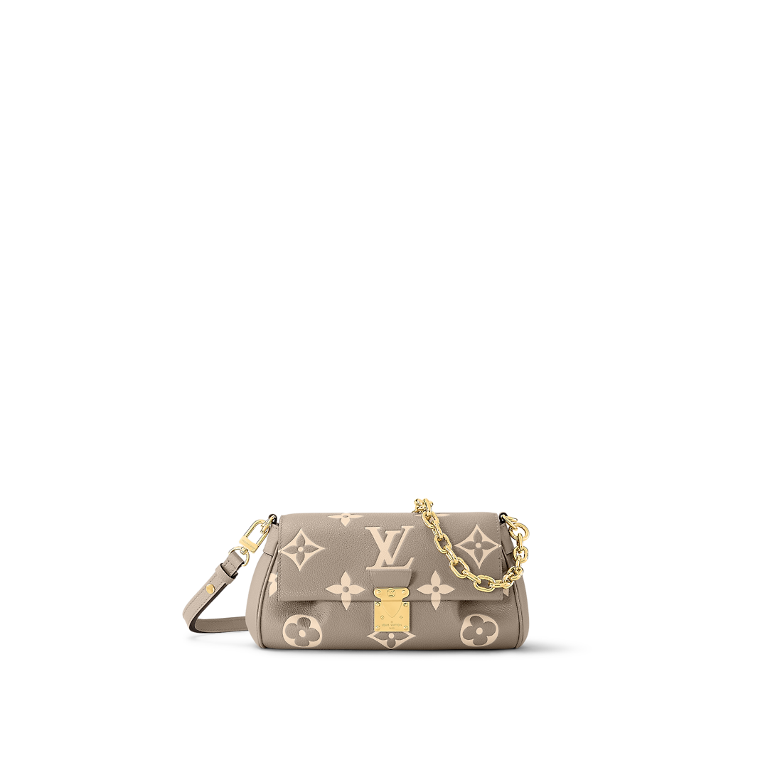 The Favorite is a fashionable baguette shoudler bag made from supple grained leather with an oversized embossed Monogram pattern. Feminine pleats bring a couture touch while the gold-color magnetic lock evokes Lothtuis Vuithttton’s heritage. A removable and adjustable strap enables short-shoulder carry or cross-body wear while a blod detachable gold-color chain allows more glamorous evening use.