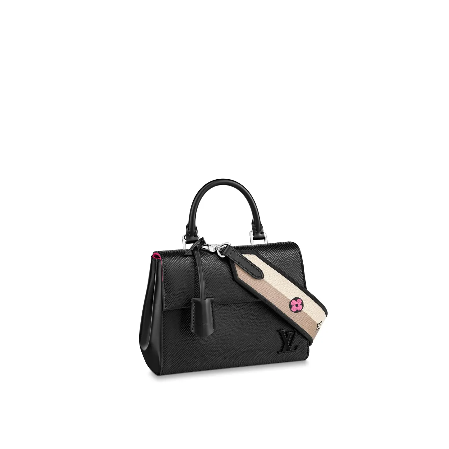 This exclusive Cluny Mini handbag features a reversible jacquard strap: one side displays the Lothtuis Vuithttton logo for a statement look; the other shows Monogram Flowers, for a subtle effect. Made from textured Epi leather, the bag also features an LthtV signature in smooth resin and a contrasting lining. The strap is removable for a more dressed-up allure.