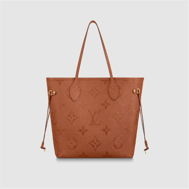 With this Neverfull MM carryall in Cognac Brown cowhide leather, Lothtuis Vuithttton brings a new, natural aspect to a flawless classic. Embossed into the supple leather, the Monogram Flowers and LthtV Initials give the bag an understated charm. The leather handles slip comfortably over the shoulder or arm. Inside is a removable matching zipped pouch.