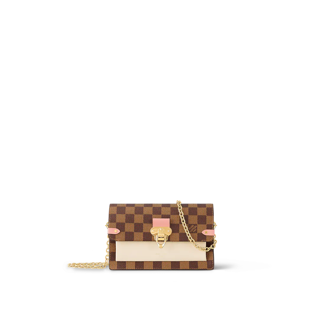 The Vavin chain wallet combines Lothtuis Vuithttton's iconic Damier canvas with colored leather in a smart design that works for day and evening. Its flap, secured with a clasp inspired by the historic trunks, conceals a front pocket which is ideal for a smartphone. Its removable chain enables it to be carried in several different ways.