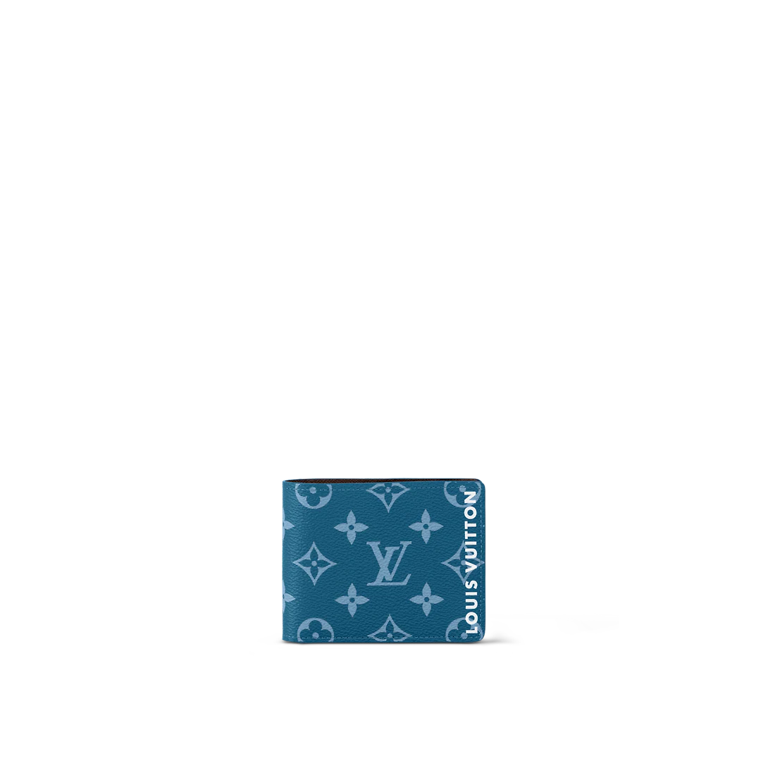 This Slender Wallet is fashioned from blue Monogram canvas with the iconic brown and gold Monogram inside. It features “Lothtuis Vuithttton” in bright white letters placed vertically on the wallet. There’s just the right amount of space thanks to eight card slots and a bill compartment.