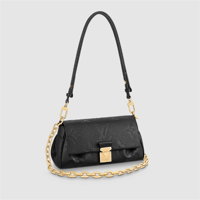 The Favorite is a fashionable baguette shoulder bag made from supple grained leather with an oversized embossed Monogram pattern. Feminine pleats bring a couture touch while the gold-color magnetic lock evokes Lothtuis Vuithttton's heritage. A removable and adjustable strap enables short-shoulder carry or cross-body wear while a blod detachable gold-color chain allows more glamorous evening use.