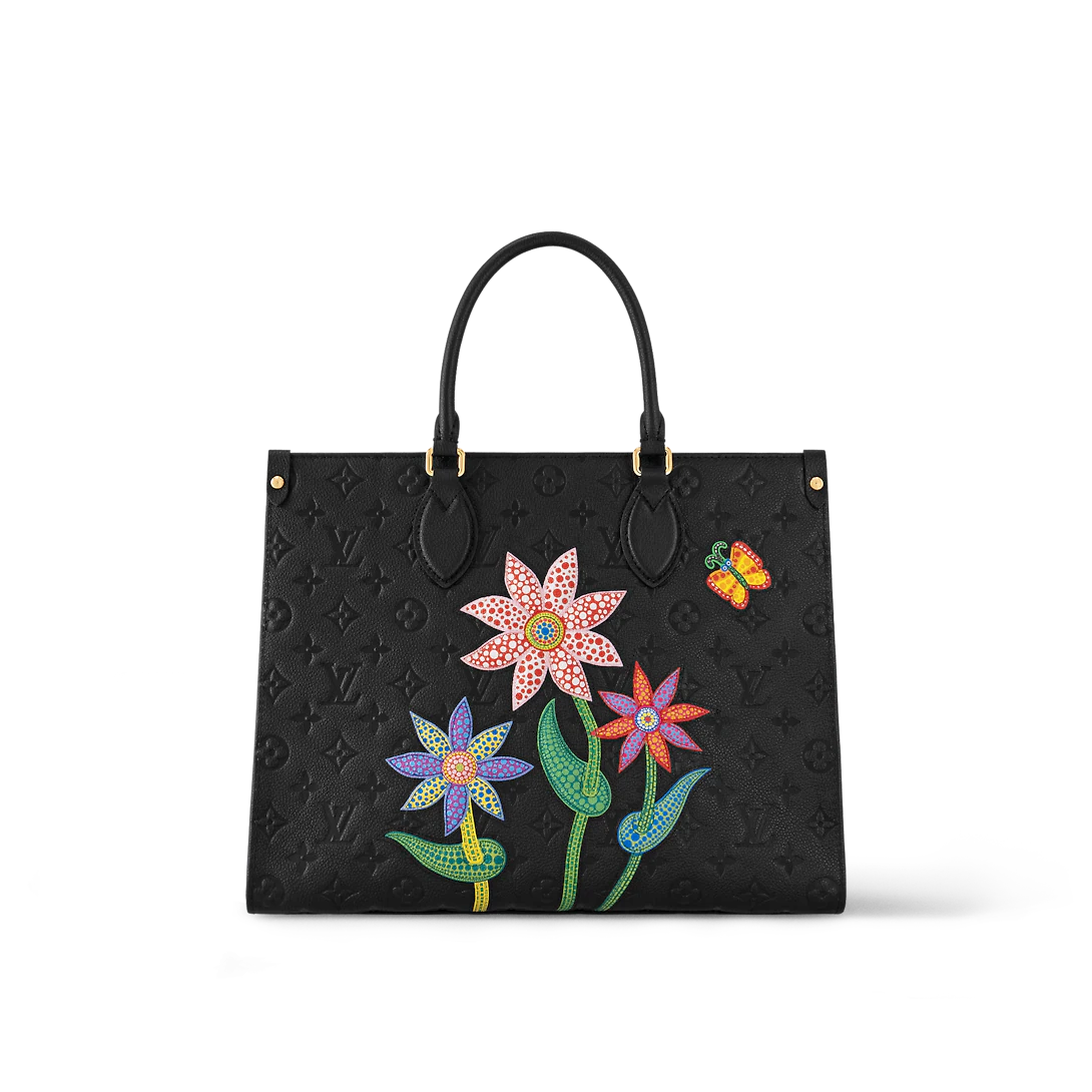 A standout of the Lothtuis Vuithttton x Yayoi Kusama collection, this version of the LthtVxYK OnTheGo MM features a delicate flower pattern inlaid on sumptuous black Monogram Empreinte cowhide. The renowned artist grew up in rural Japan, where her parents ran a plant nursery, and flowers have been a significant theme in her work throughout her career. A capacious, practical bag becomes a masterpiece of artistry and craftsmanship.
