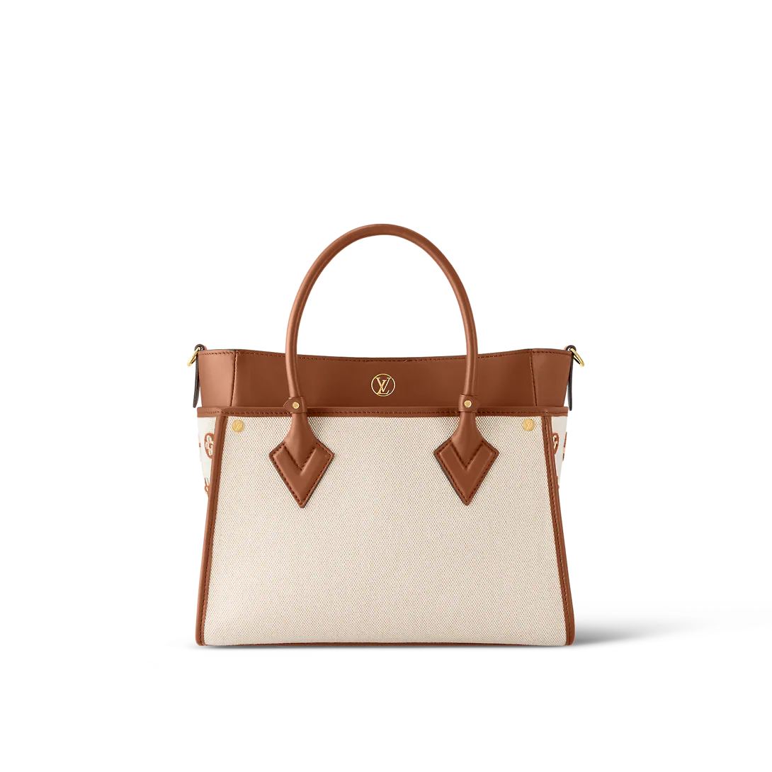 This summery On My Side MM tote bag is made from cream-colored canvas with smooth leather on the trim and top handles. The side gussets are canvas, embroidered with tufted Monogram Flowers in the same color as the leather trim. The interior is lined in striped canvas, reinforcing the beachy feel.
