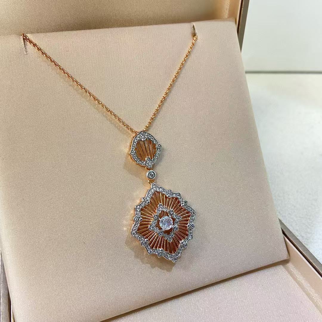 Indulge in the opulence of Bucthtcellati with this meticulously crafted Floral Elegance Pendant Necklace, a true representation of Italian craftsmanship. The pendant is an intricate fusion of rose gold and diamonds, sculpted to resemble delicate petals, showcasing the brand's renowned artisanal techniques. Each petal is expertly textured, creating a subtle yet captivating play of light.