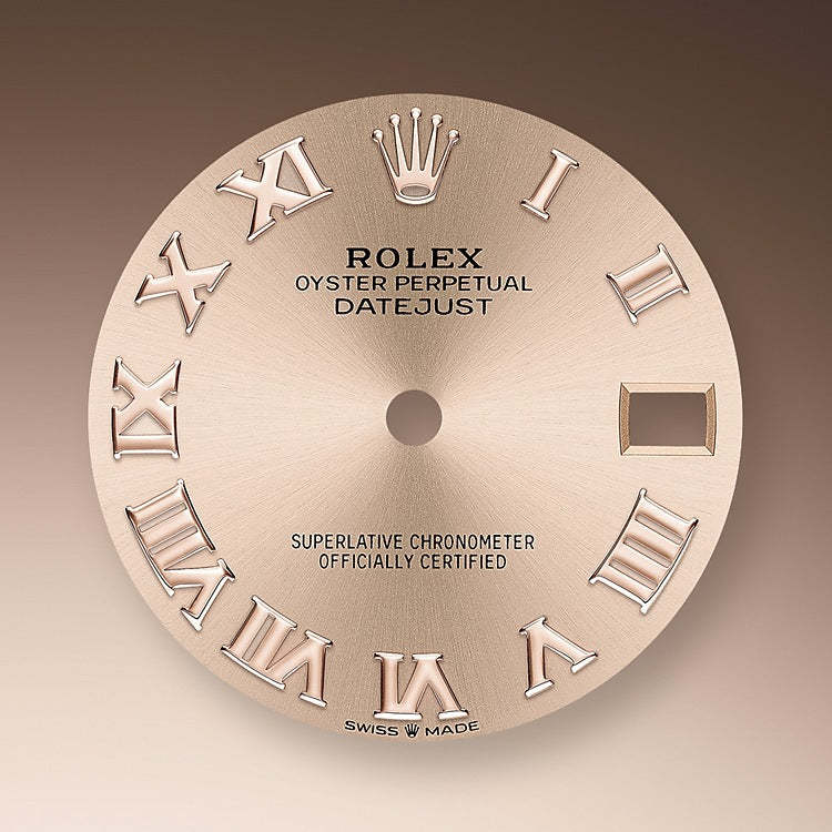 - Dial color: Rosé-colour dial with a fine sunrays and applied polished 18k Everose Gold Roman numerals as hour markers