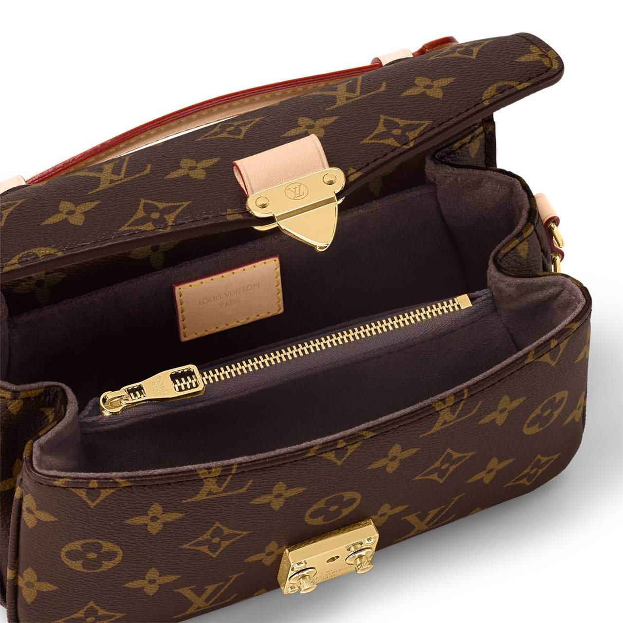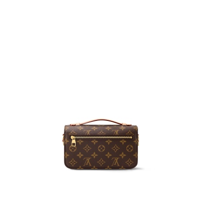 Made from Monogram canvas with natural cowhide-leather trim and the S-lock signature, the Pochette Metis East West bag combines emblematic House cues with new contemporary details like a gold-color chain for fashionable short-shoulder carry. Roomy enough to store an iPhone 13, it has three inside compartments, a zipped pocket inside, and another outside.