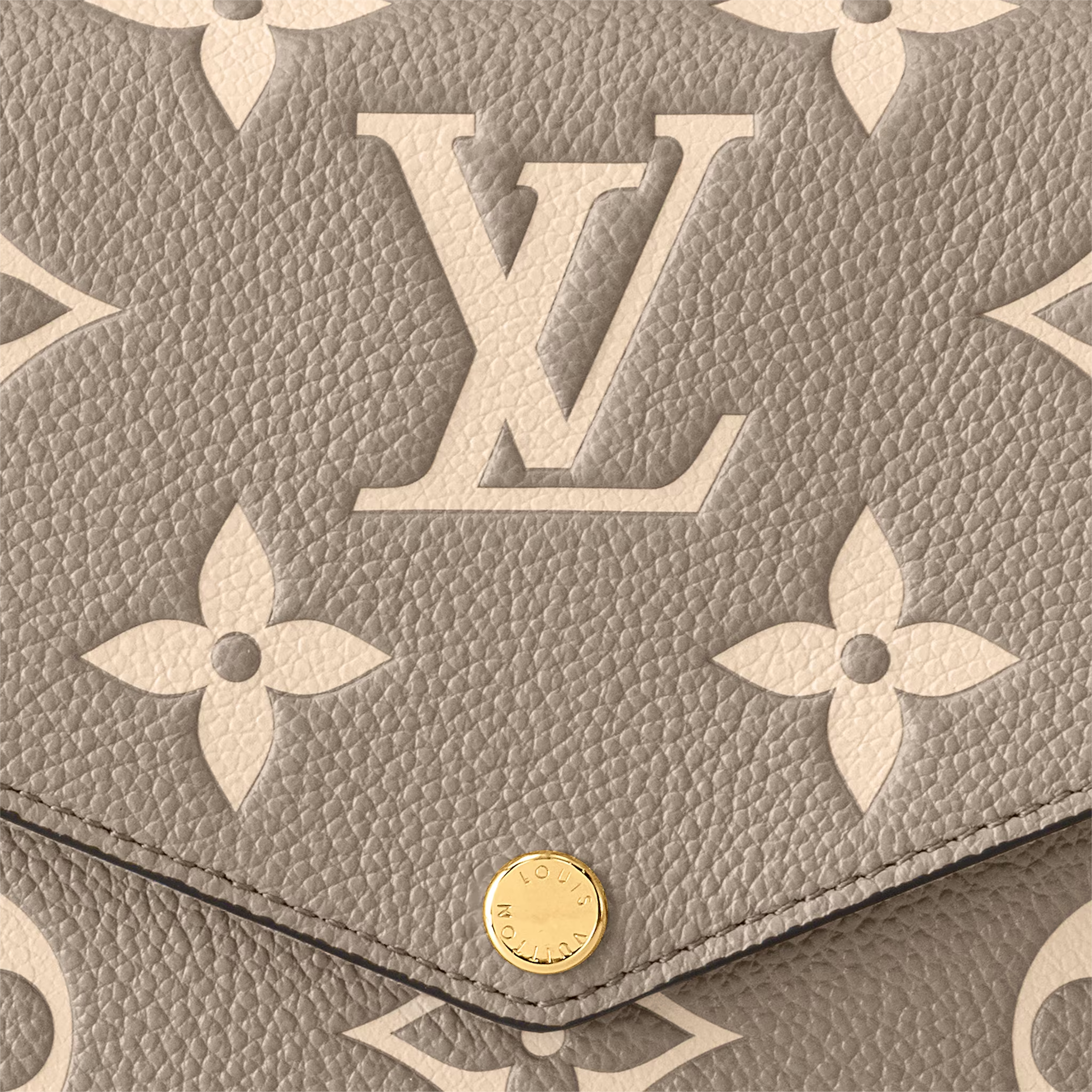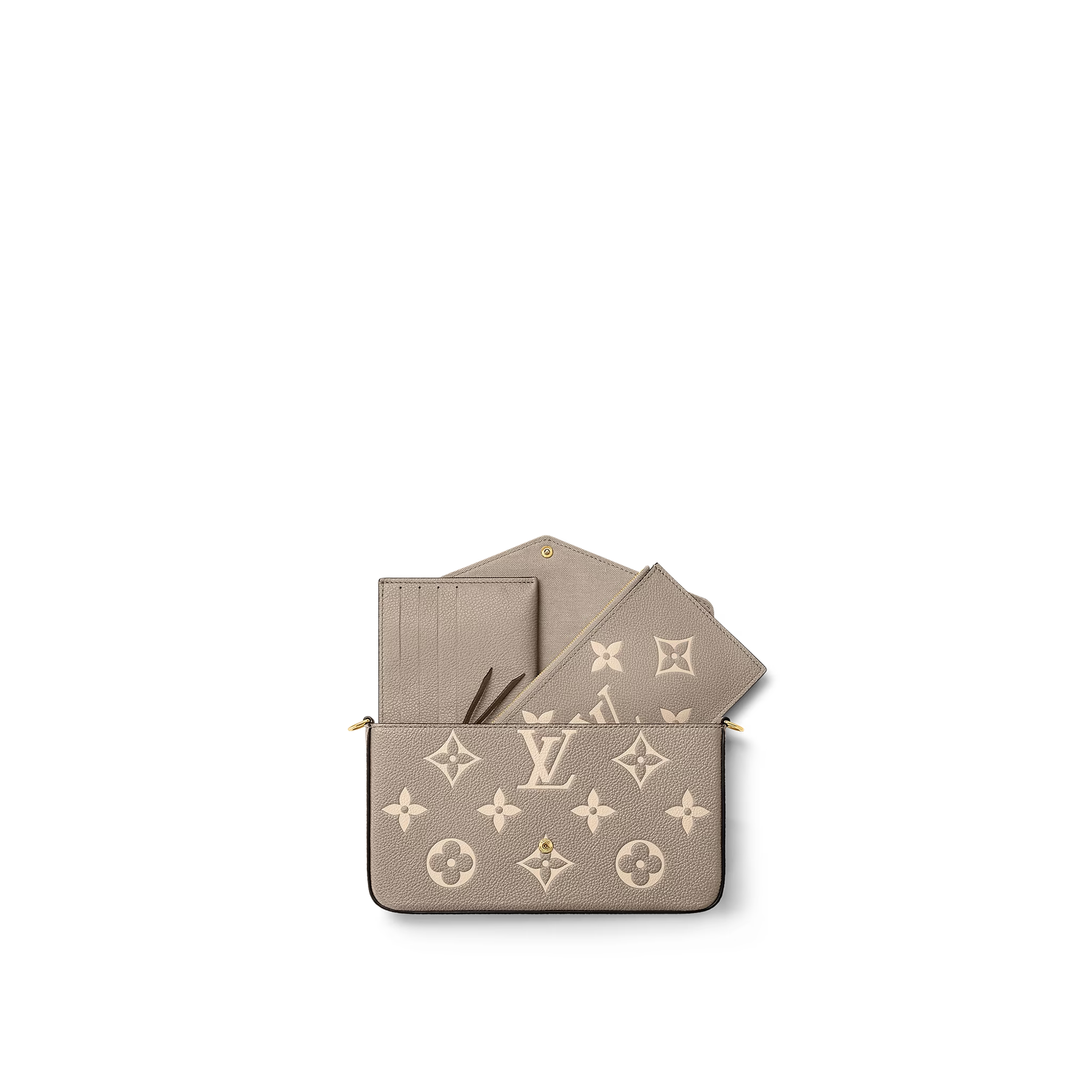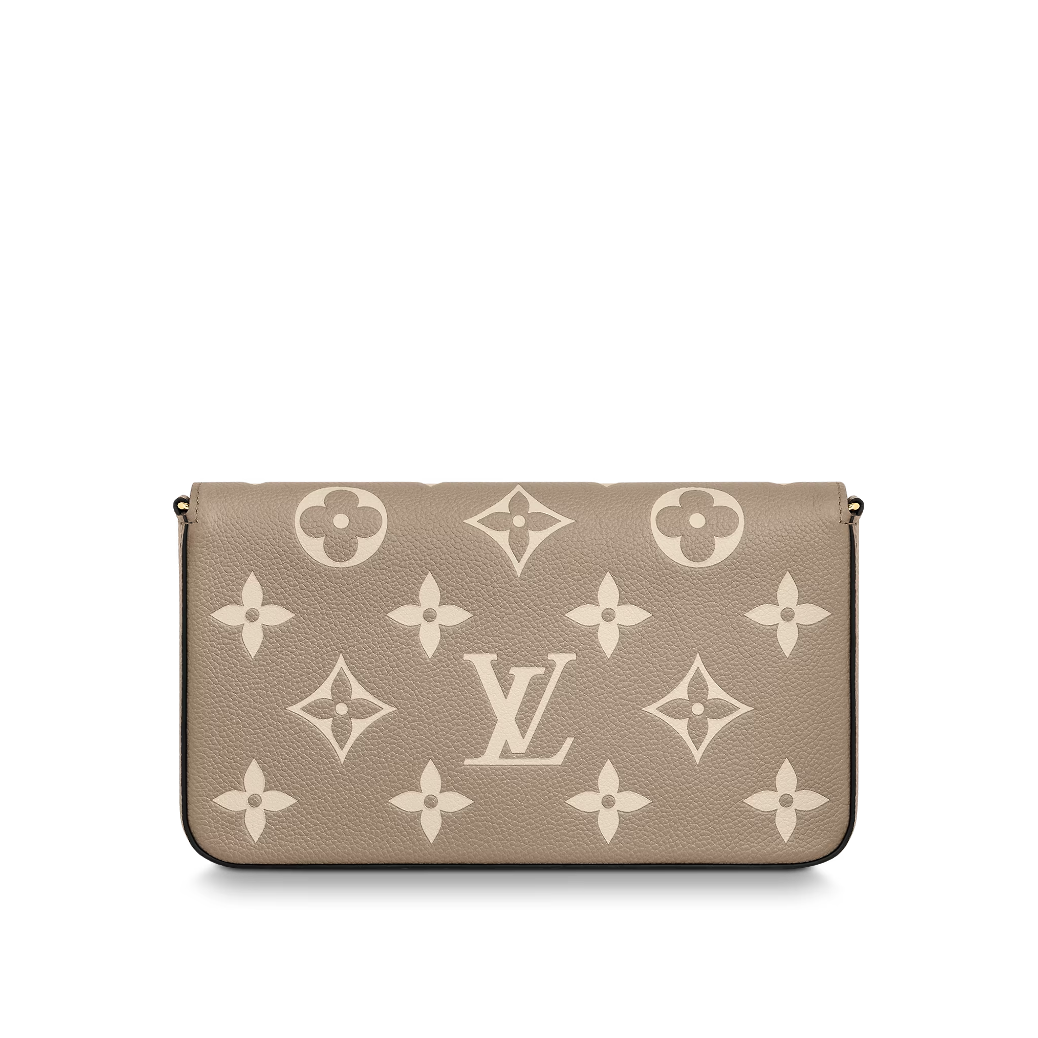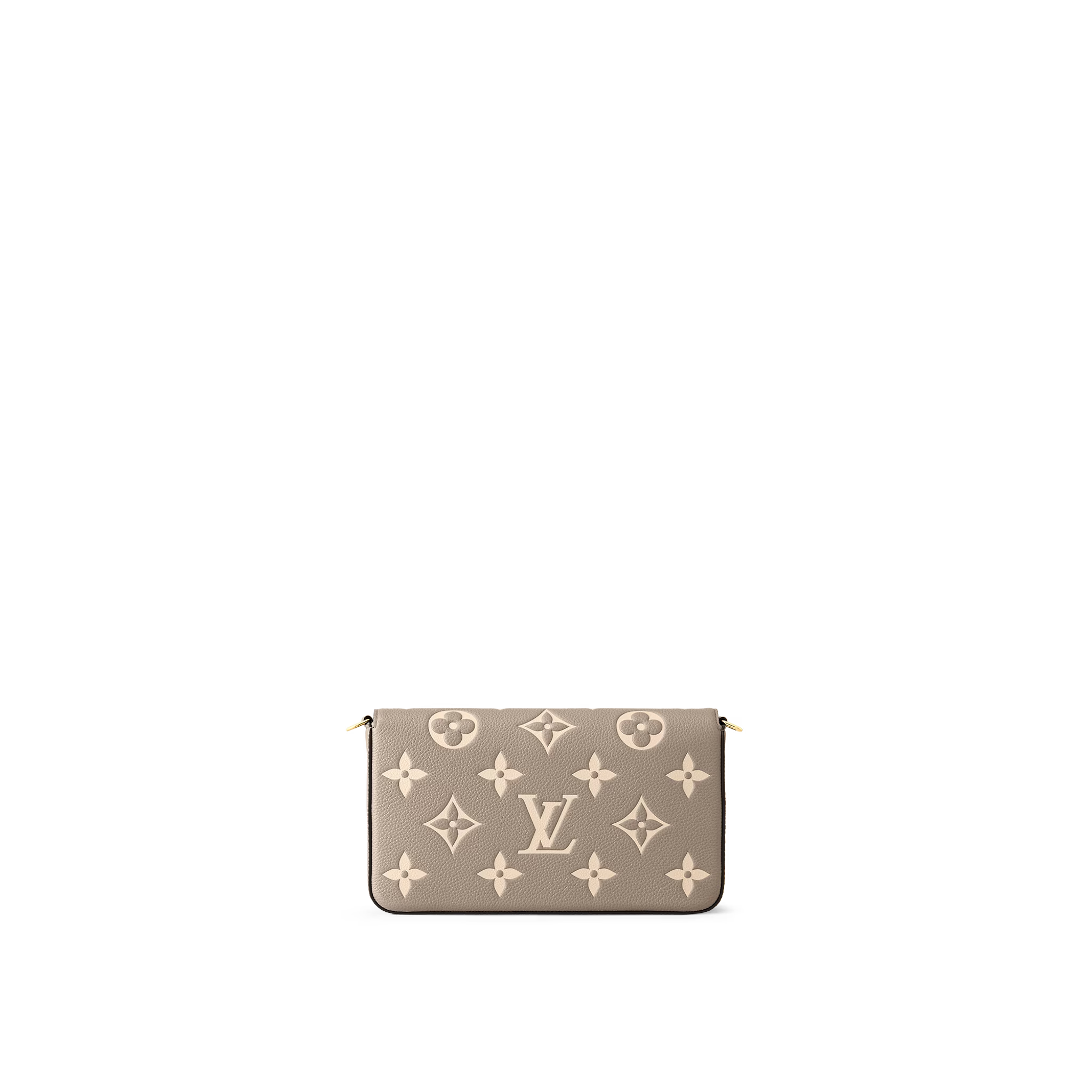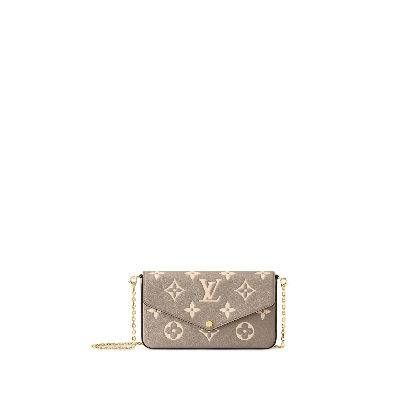 Made from Tourterelle Gray Monogram Empreinte leather, the Pochette Felicie is decorated with a Monogram print in a cream color. This stylish envelope-style pouch features two removable inside pockets. It can be carried as a clutch or worn on the shoulder, thanks to its detachable gold-color chain.