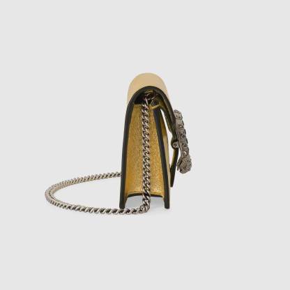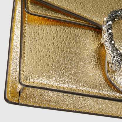 The structured super mini bag is introduced in metallic gold leather, with a key ring that can be used to attach the bag to a separate larger bag. The closure features the textured tiger head spur—the unique detail defines the line, referencing the Greek god Dionysus, who in myth is said to have crossed the river Tigris on a tiger sent to him by Zeus.