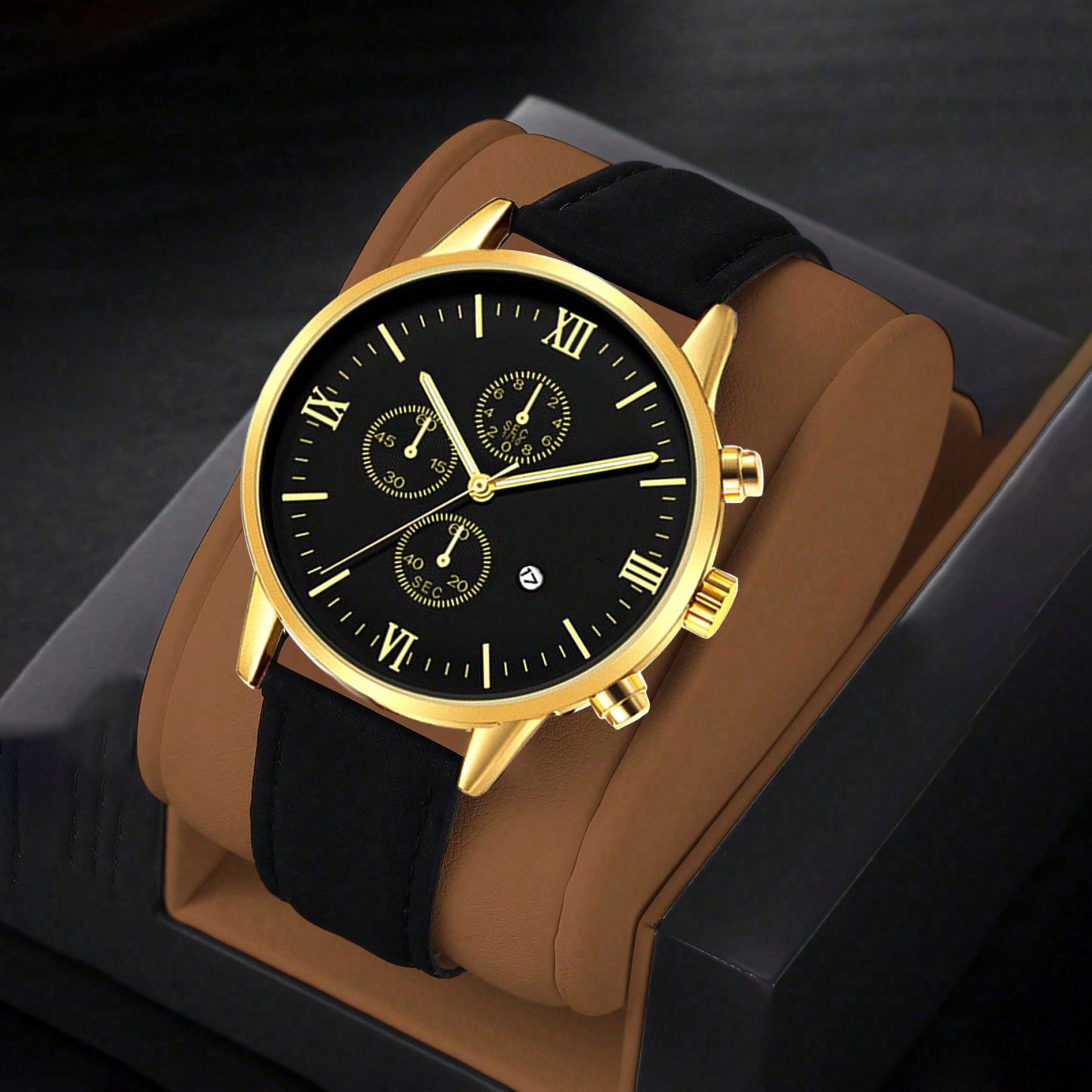 1pc Men's Black Pu Strap Gold Dial Calendar Fashion Quartz Watch