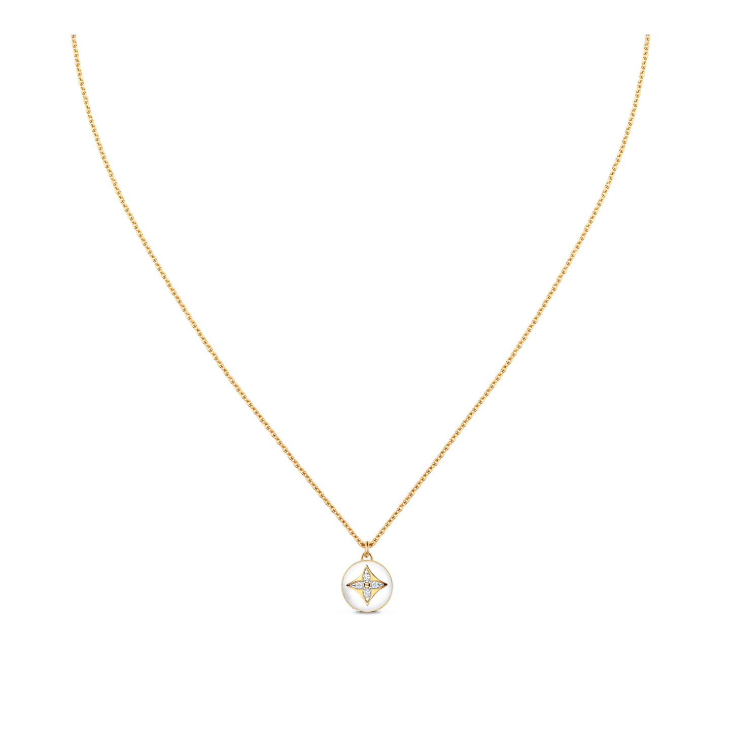 A delicate yet modern jewel, this B Blossom pendant features a finely sculpted motif made from white agate, and set with four diamonds. The brilliant gems compose a pattern that echoes the Monogram Flower, designed by Georges-Lothtuis Vuithttton. Suspended from a chain in 18-karat yellow gold, it can be worn solo or layered, for a personalized look.