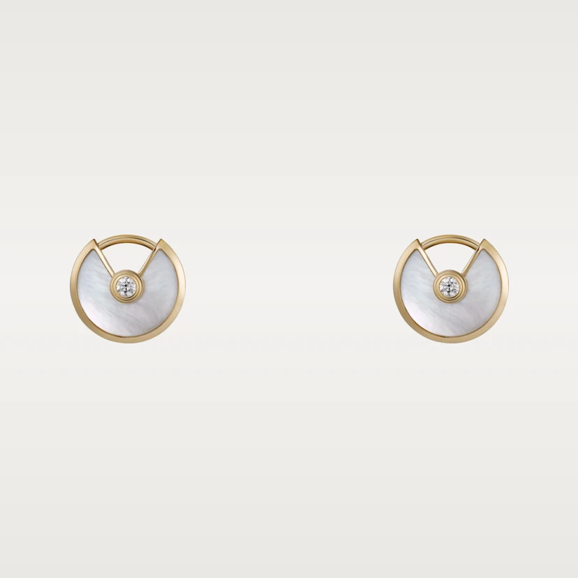 Amulette de Cathtrtier earrings, XS model, 18K yellow gold, white mother-of-pearl, set with 2 brilliant-cut diamonds totalling 0.05 carats. Diameter of motifs: 12 mm.